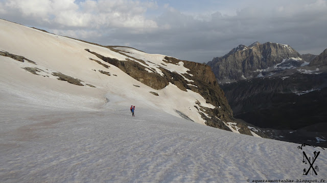 Bien nous en a pris... D'une, on a un peu galéré à trouver un passage pour traverser le torrent, heureusement qu'on était de jour. Ensuite, en remontant la moraine, on a quitté le fil assez tôt (vers 2500m, au niveau de la Tête de Bouc), alors qu'il fallait continuer bien plus haut. Bon, on s'est juste retrouver à remonter dré dans le pentu pour retrouver le fil, mais pas dit que le lendemain de nuit on aurai vu qu'on c'était trompé...