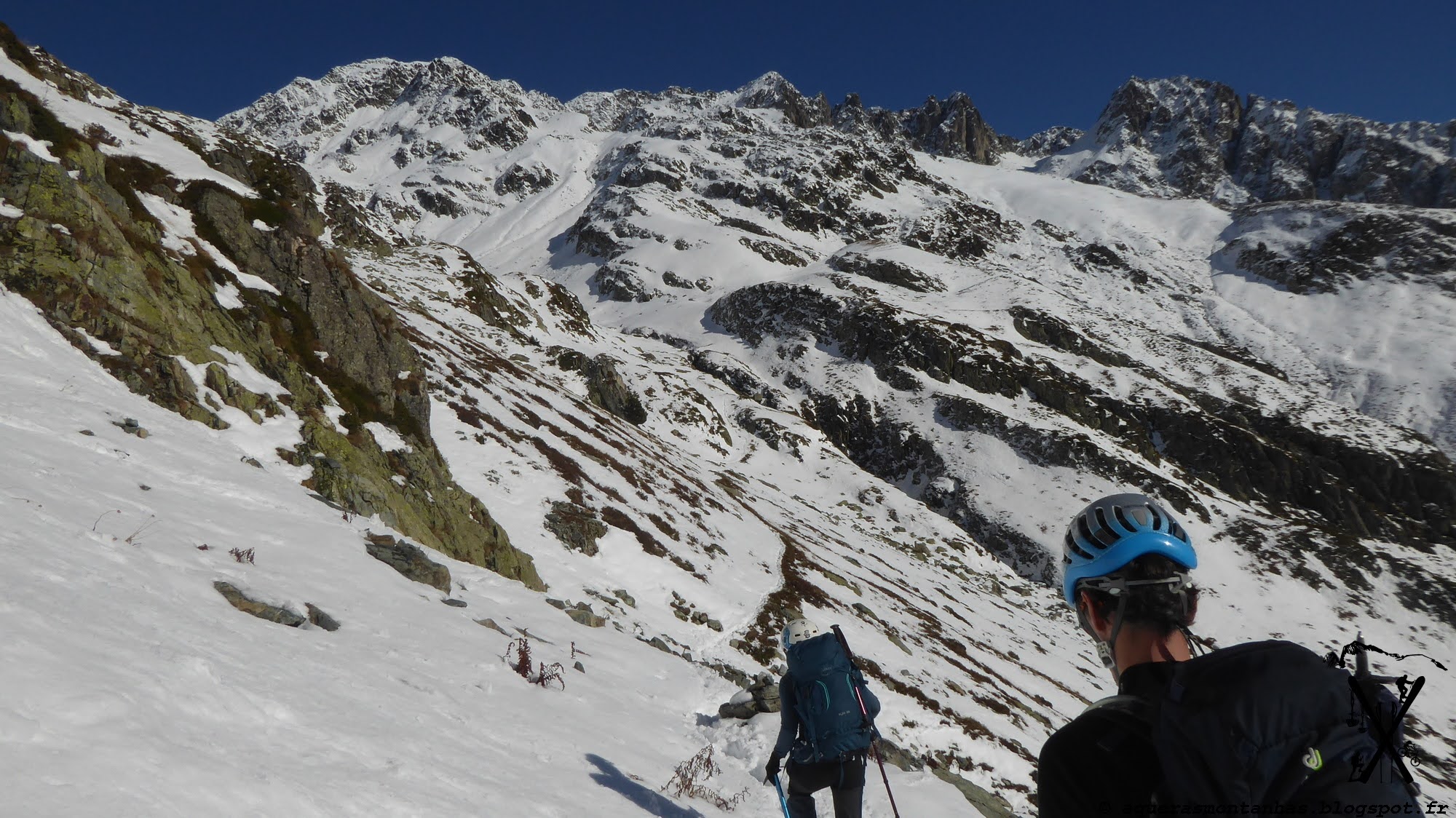 On s'arrête un peu pour voir la suite, ce n'est finalement pas engageant : il n'y a pas tellement de neige, on est vite sur les rochers. En cas de glissade, c'est direct en bas... Du coup, demi tour sans trop de regrets et activation du plan B : le col de l'Aigleton.