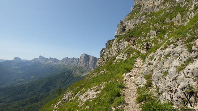 Du Pas de la Balme, les choses sérieuses commencent! Il y a une traversée à flanc un peu exposée, suivi d'une série d'épingles bien serrées et dans la pente... Va falloir faire du nose turn.